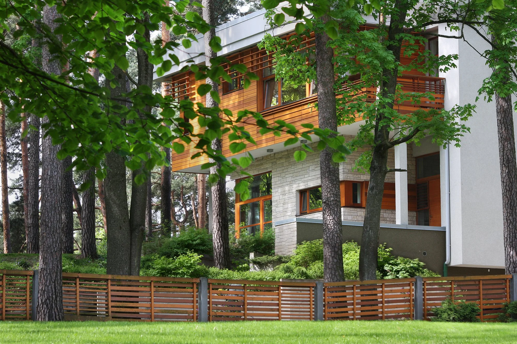 The building was designed making efficient use of the terrain of the Mežaparks dune and respecting the pine trees that grow in this land parcel. The location of trees, terrain and the layout of the premises towards cardinal points determined the shape of the building. The glazing of indoor premises faces the best views; terraces and cantilevers shape a multi–layered boundary between indoor and outdoor space. Positioning of the windows enables daylight to penetrate the entire building and interact with interior textures at various times of the day. Individual design of stairs, fireplace, doors and built–in furniture.